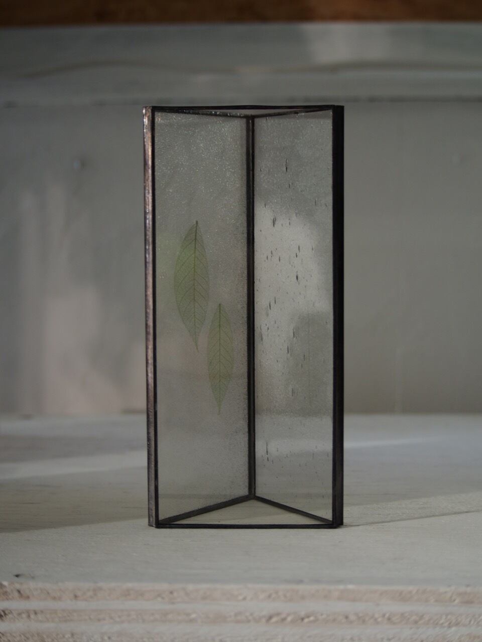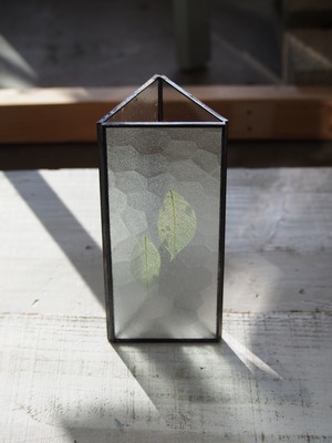 【HACOMIDORI】の代名詞ともいえる三角柱型、廃ガラスと植物を組み合わせたランプシェード。