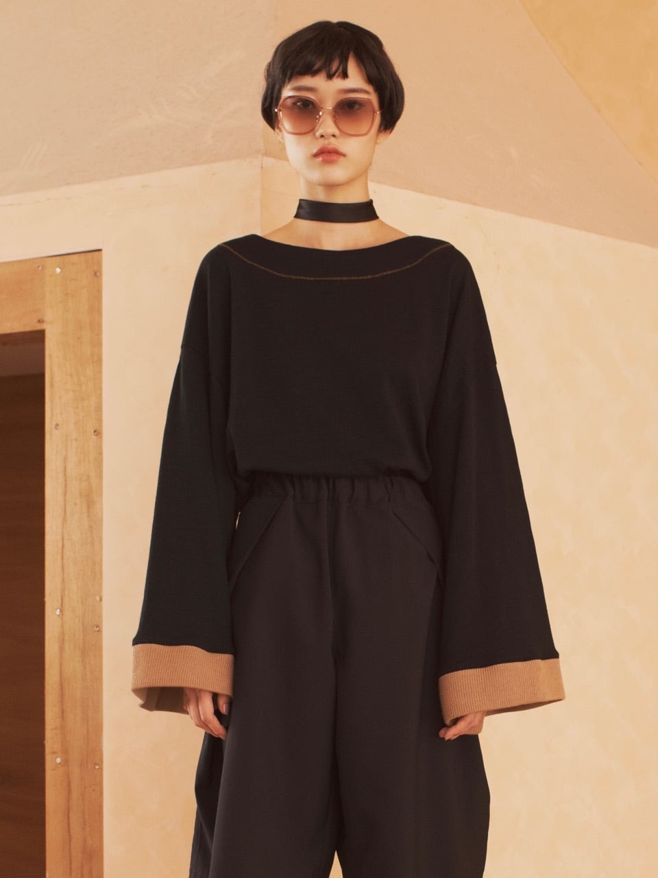 ボートネックに袖口に向かって広がっている袖が特徴の"SFちっく"なデザインです。