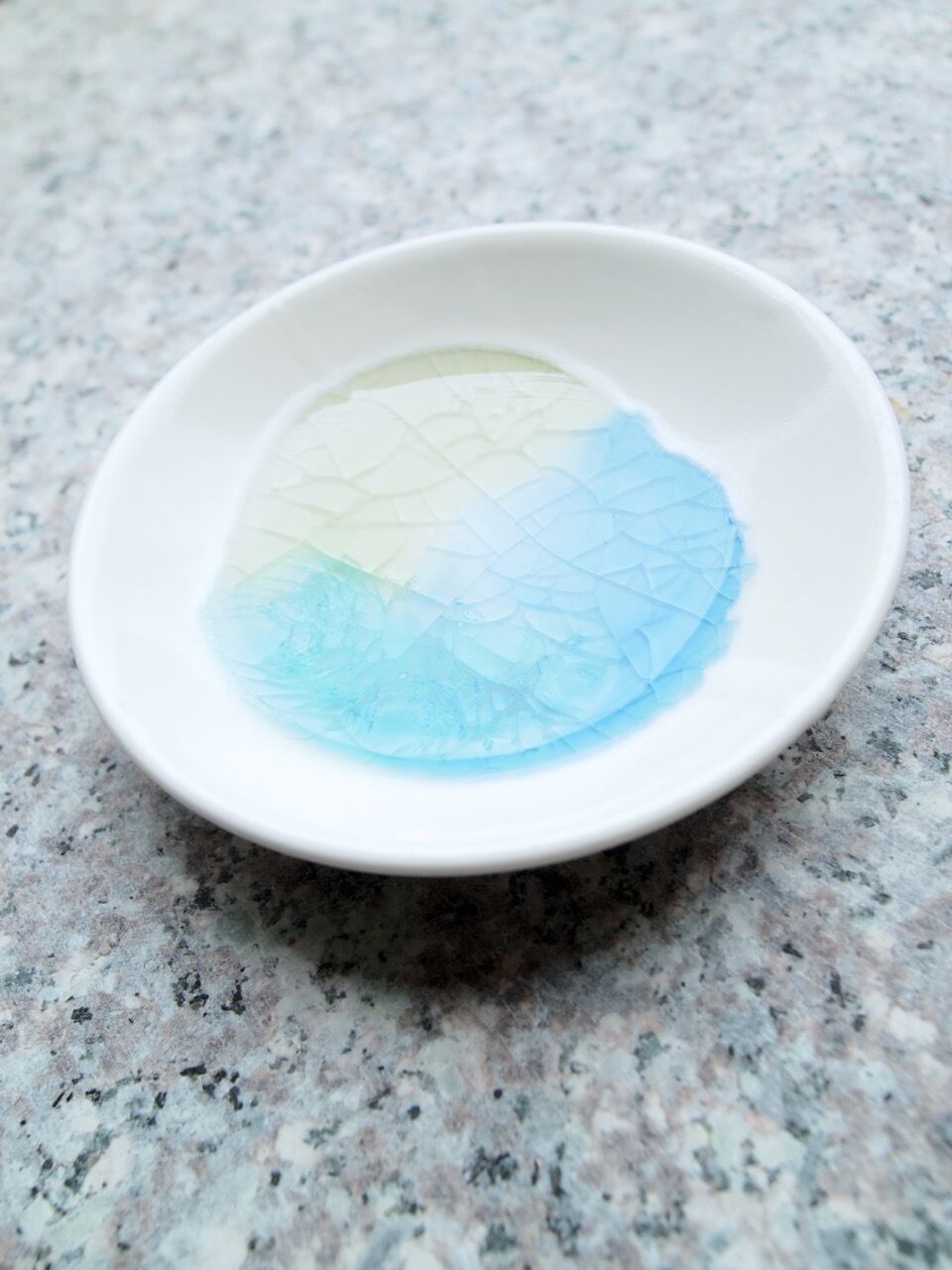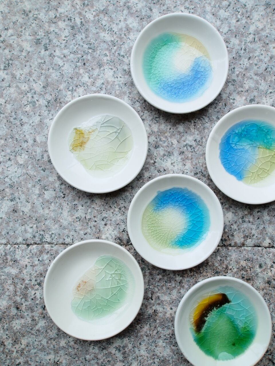 ガラスと陶芸の釉薬(ゆうやく)が 混ざり溶け合い、重力や表面張力の