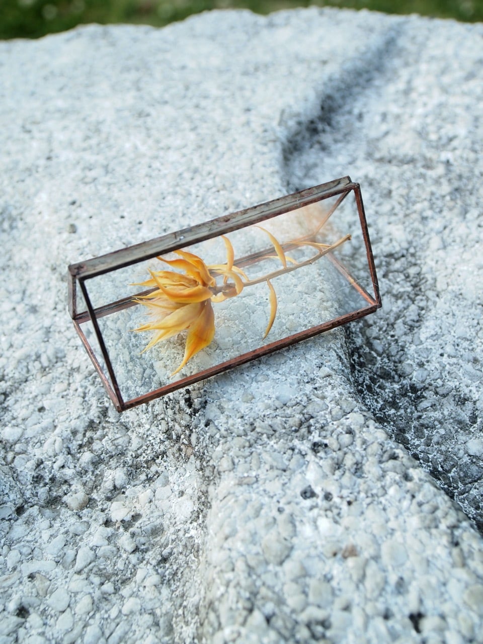 hacomidori のシグニチャー、草花を器に閉じ込めた「植物標本」。