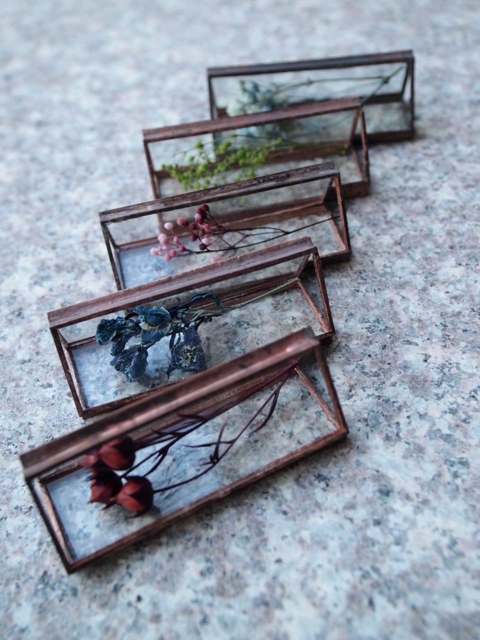 hacomidori のシグニチャー、草花を器に閉じ込めた「植物標本」。