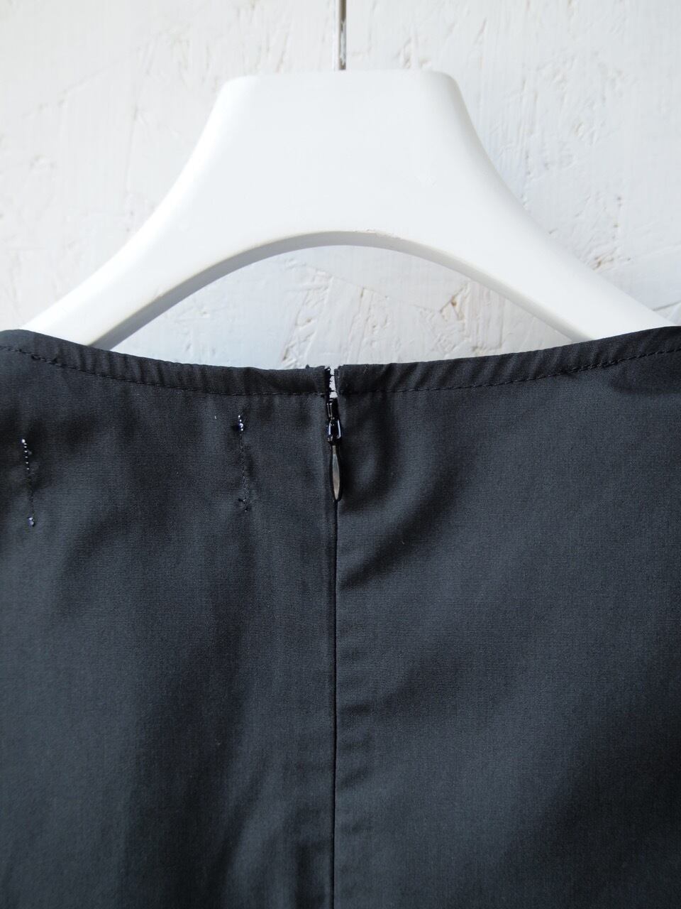 ハリのあるシャツ生地を用いたトップス、脇部分にハトメと平紐を大胆に配置しています。
