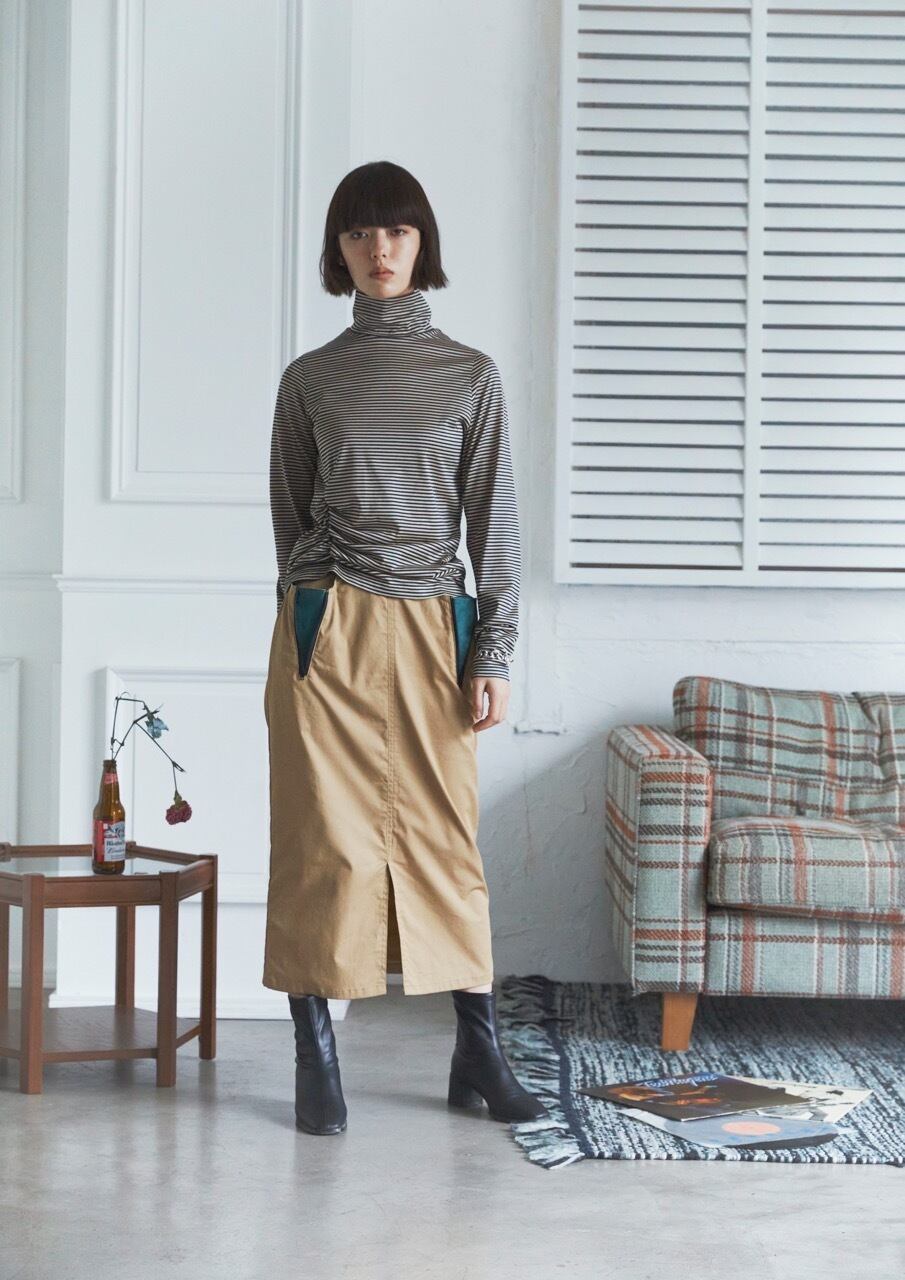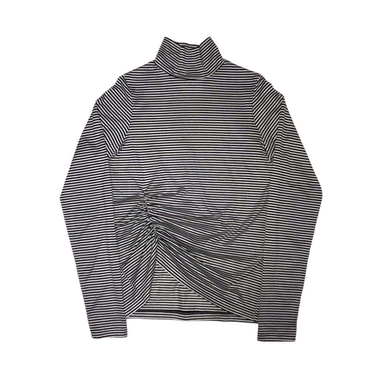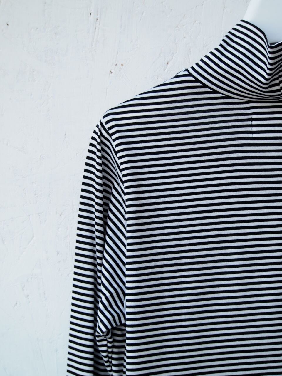 ピッチの細かいボーダーのハイネックの長袖Tシャツ。