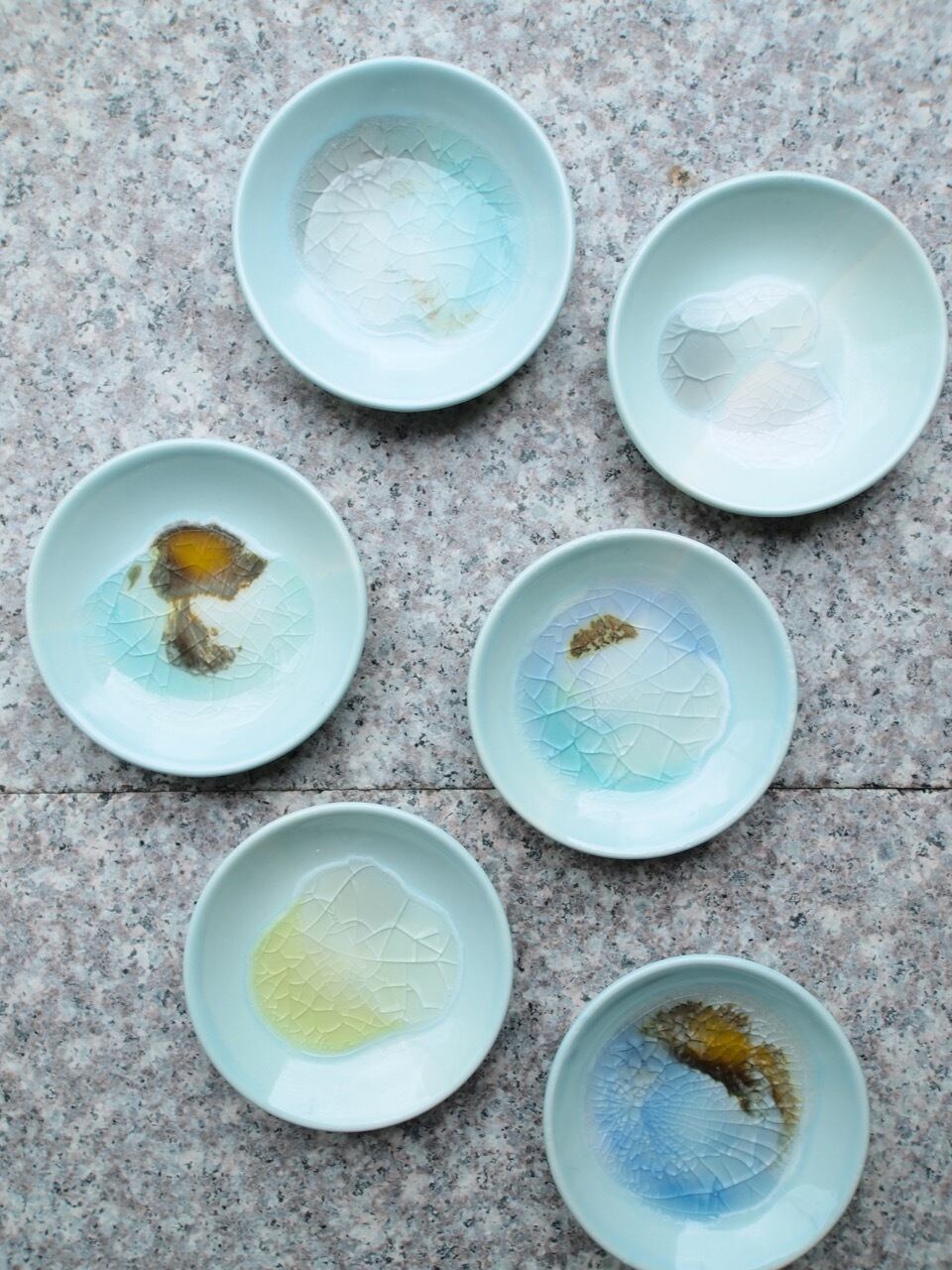 ガラスと陶芸の釉薬(ゆうやく)が 混ざり溶け合い、重力や表面張力の