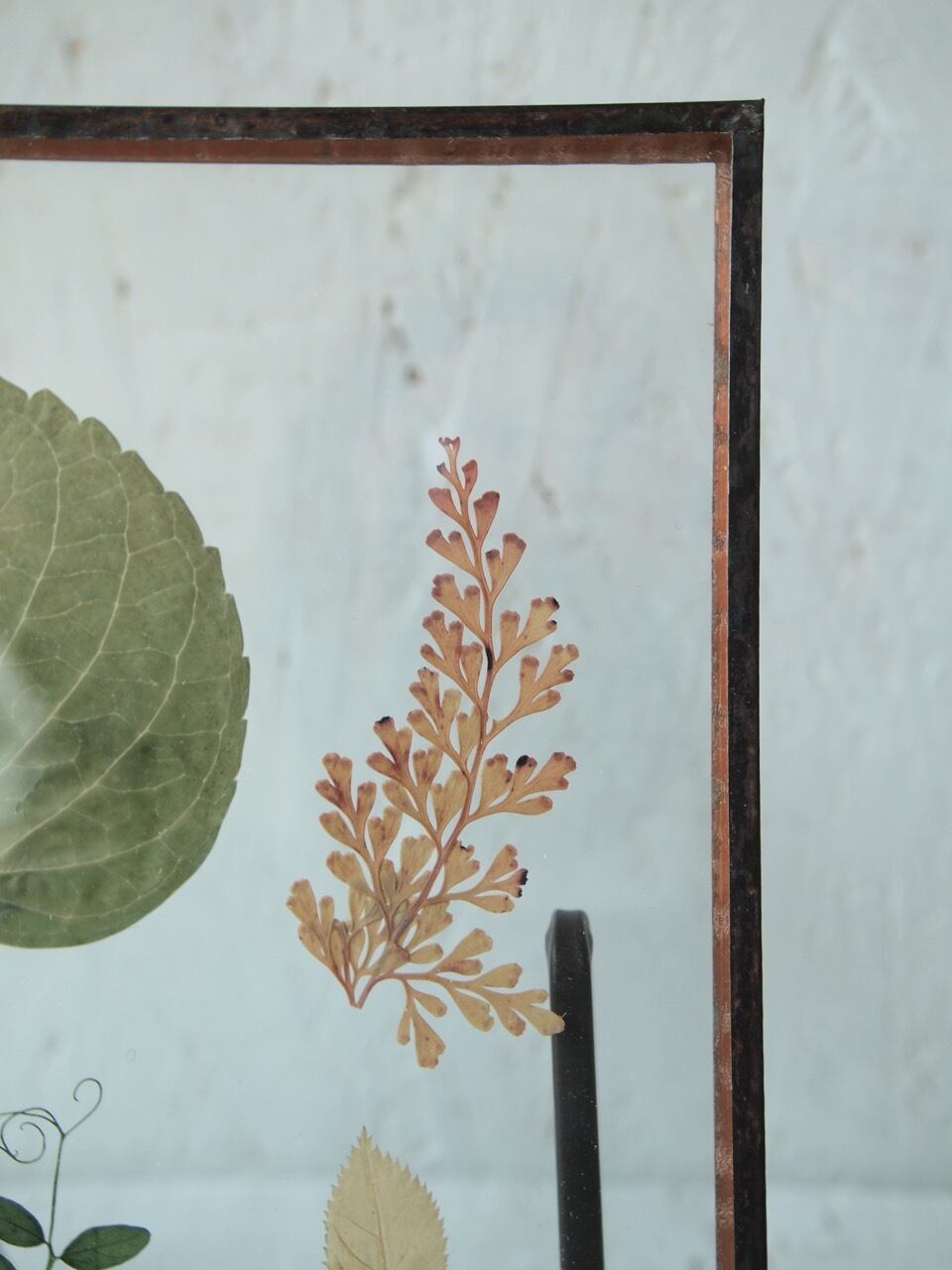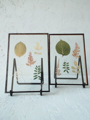 様々な植物を押し花の様にガラスに閉じ込めコラージュ。