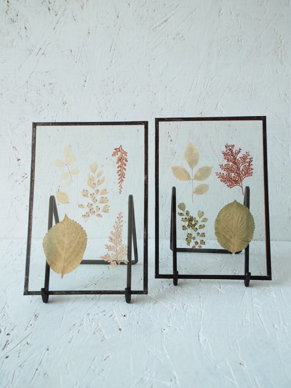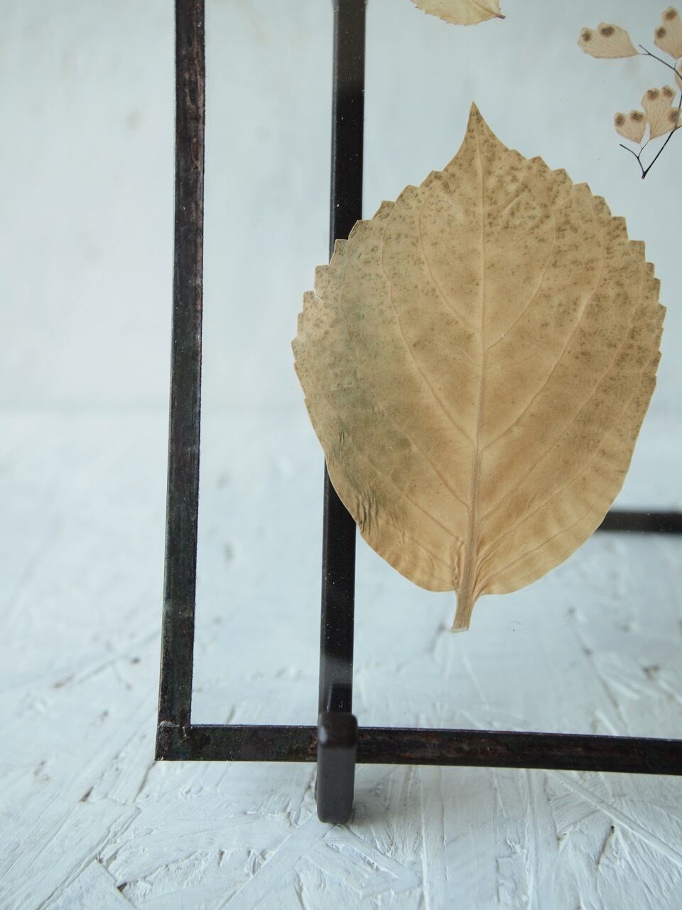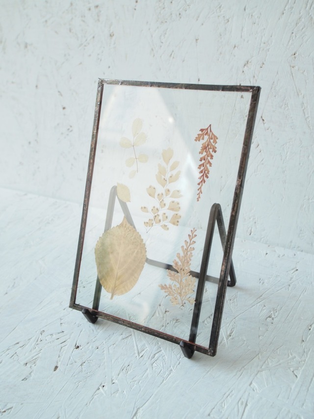 様々な植物を押し花の様にガラスに閉じ込めコラージュ。