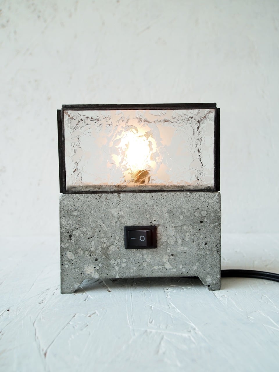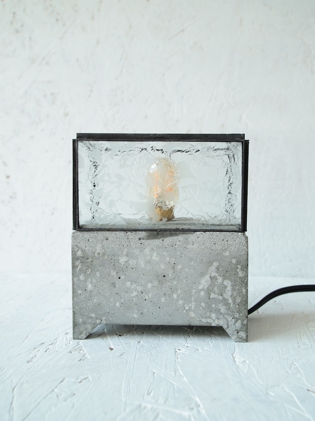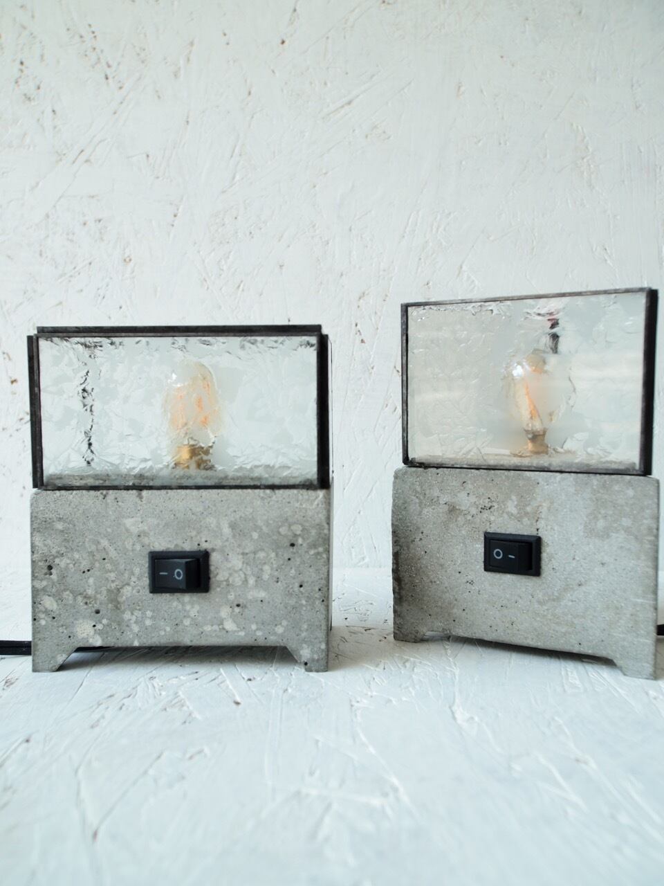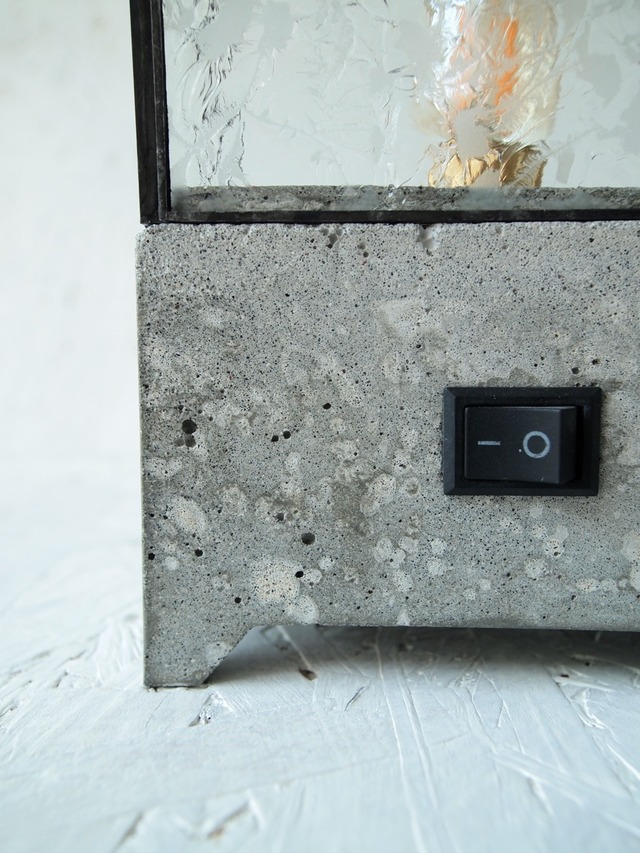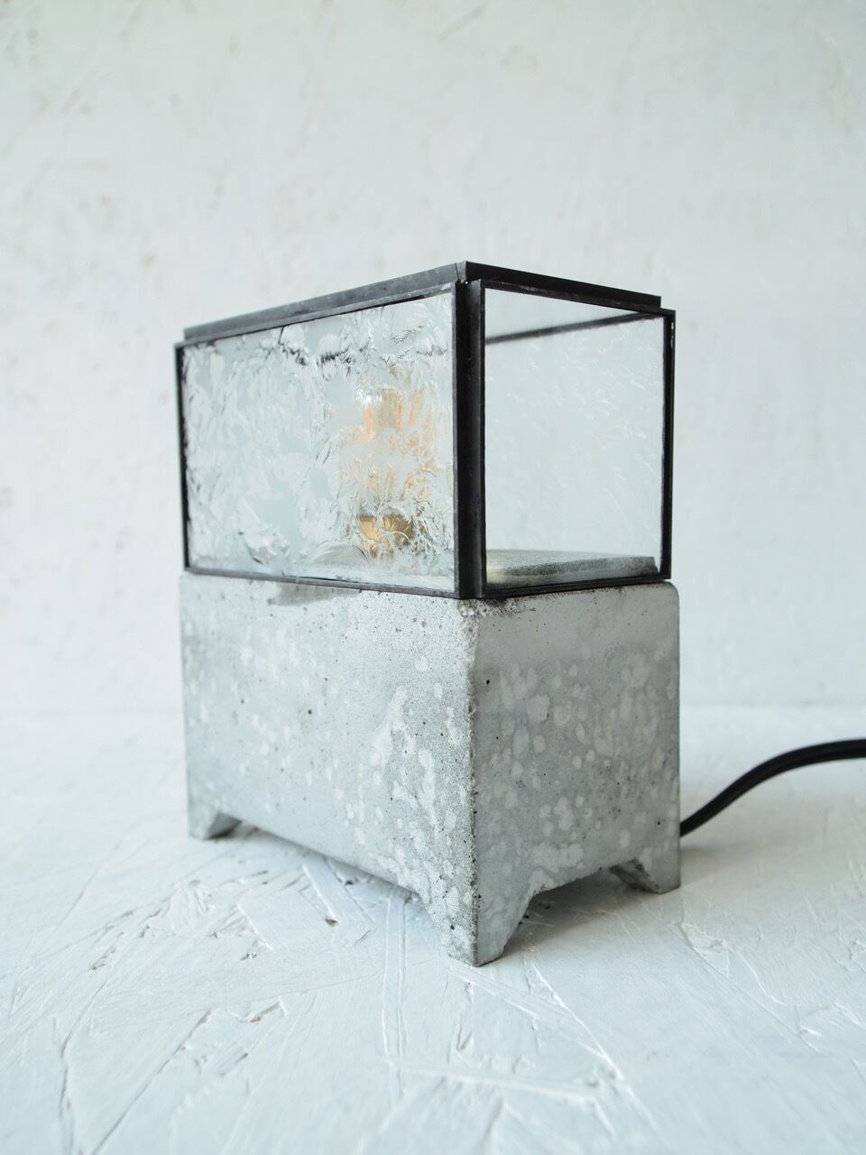 セメントの台座が重厚感を、ガラス部分とライトの明るさが柔らかさと軽やかさを演出。